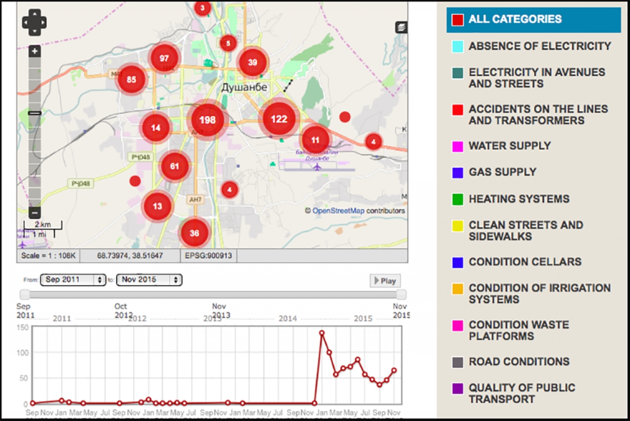 Goals and objectives: The joint innovative solution of the local government (municipality) of Dushanbe city and the Public Fund Civil Internet Policy Initiative aims to improve the quality of municipal service delivery through participation of inhabitants in reporting and mapping municipal services problems and monitoring their improvement through an online interactive platform. The platform, officially launched on 1 February 2012, is available at http://www.mometavonem.tj/php/?l=en_US