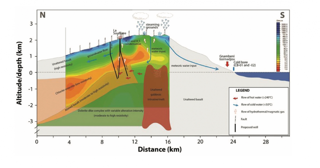 − l’existence d’un réservoir géothermique autour du volcan Karthala à une profondeur entre 1700 et 1900 m, et une source de chaleur pour la géothermie à une profondeur de plus de 5000 mètres ;